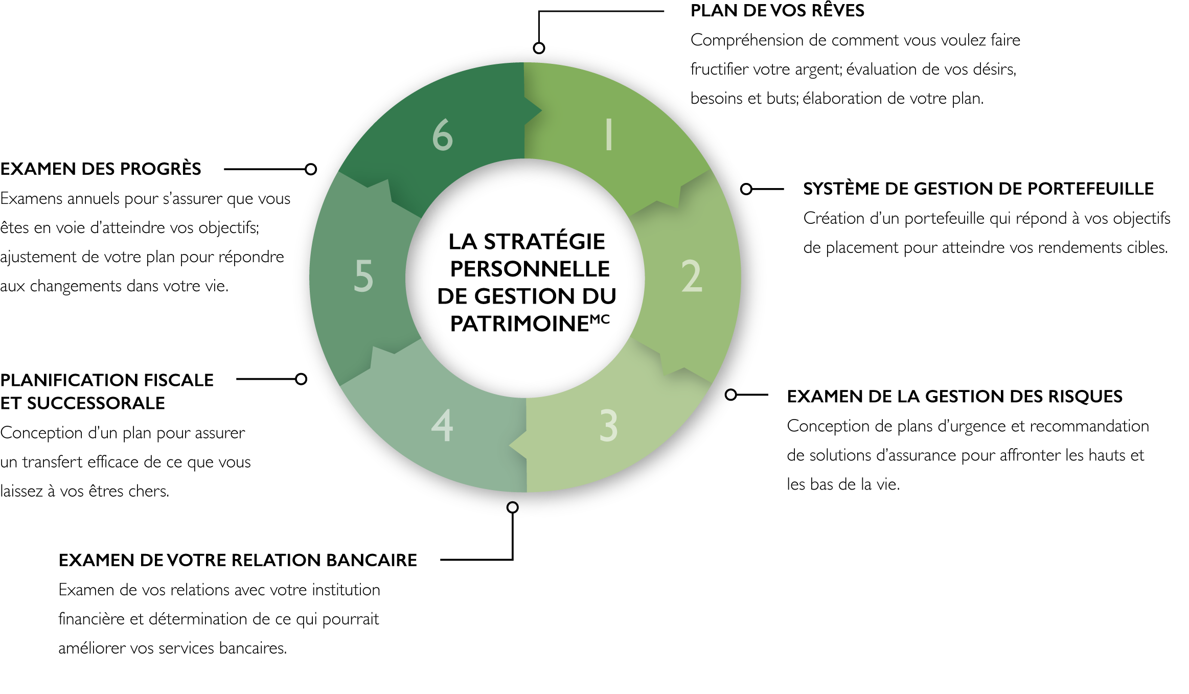 Nos conseillers adoptent un processus discipliné recourant à la Stratégie personnelle de gestion du patrimoine. Ce système leur permet d’examiner tous les aspects de votre bien-être financier — de l’évaluation de votre situation actuelle à la compréhension de vos rêves et de vos aspirations — afin de construire le plan qui vous convient.